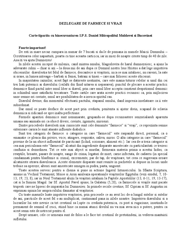 2.10.2019 · și dezleagă pe robul tău (numele), împreună cu toate ale casei lui, de toate legăturile satanei, ale magiei, ale farmecelor și ale puterilor potrivnice. Împiedică tu, doamne dumnezeul părinților noștri toată lucrarea satanei, tu cel ce dai dezlegare de magie, de farmece, de vrăji și de toate lucrările satanicești și de toate legăturile lui, și distruge toată lucrarea. Imparatul imparatilor si domn a domnilor, slava tie. 9.2.2013 · dumnezeule milostiv fii nouă si ne păzește de toată lucrarea vrăjmașului amin amin amin slăvit să fie domnul dumnezeul nostru în cer. Și dezleagă pe robul tău (numele), împreună cu toate ale casei lui, de toate legăturile satanei, ale magiei, ale farmecelor și ale puterilor potrivnice. Împiedică tu, doamne dumnezeul părinților noștri, toată lucrarea satanei, tu, cel ce dai dezlegare de magie, de farmece, de vrăji și de toate lucrările satanicești și de toate legăturile lui, și distruge toată lucrarea... Și dezleagă pe robul tău (numele) împreună cu toate ale casei lui de toate legăturile satanei, ale magiei, ale farmecelor și ale puterilor potrivnice.